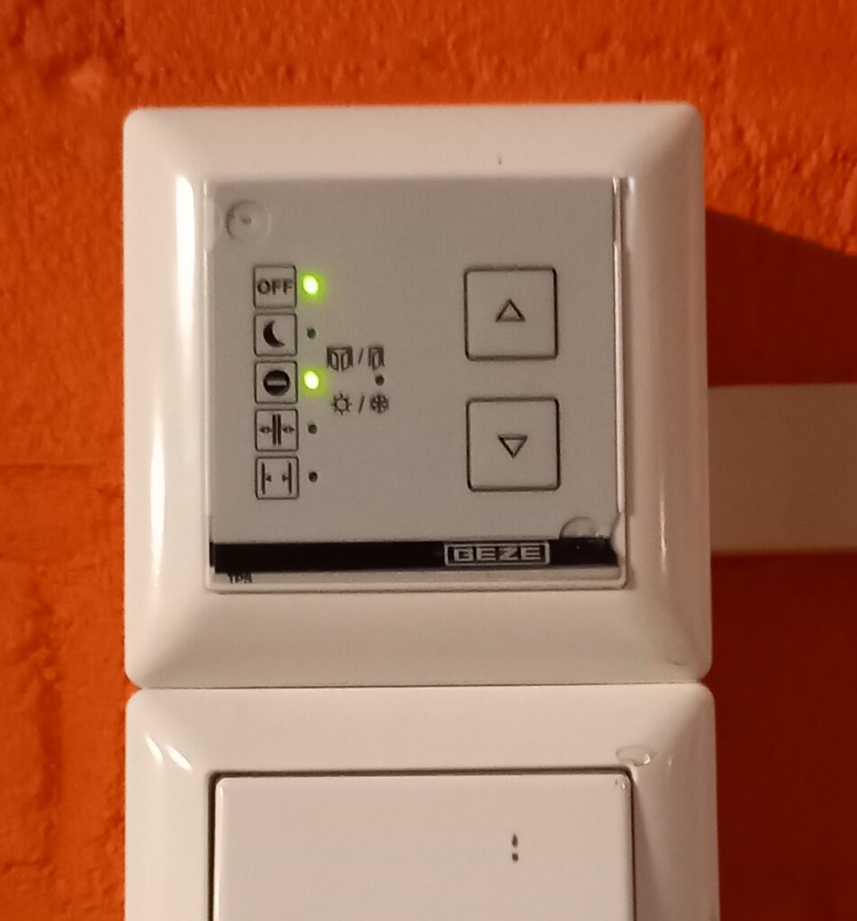 Bij binnenkomst brandt het maantje. Dat is de beveiligingsstand. Met de pijltjesknoppen kun je van boven naar onder de volgende standen kiezen: